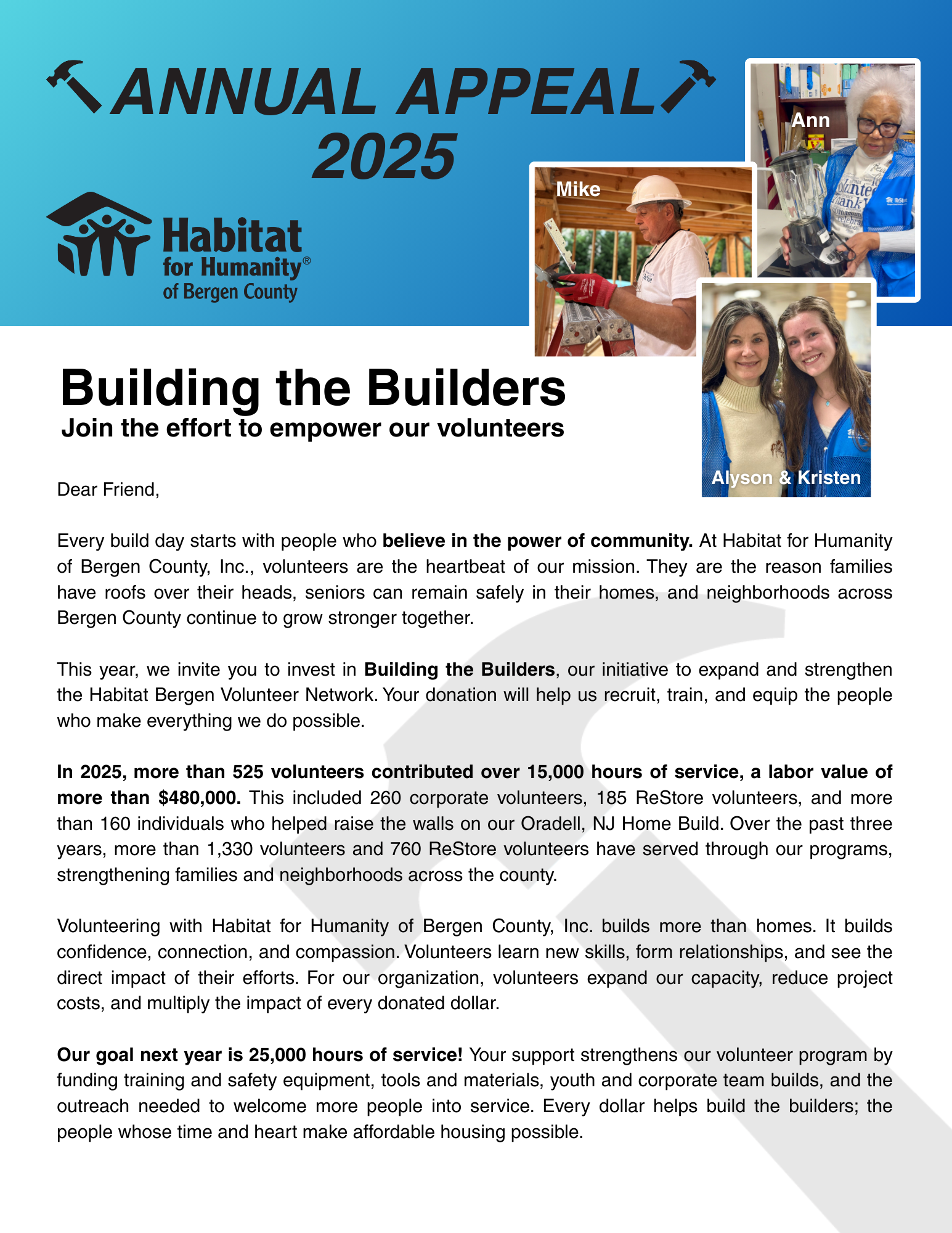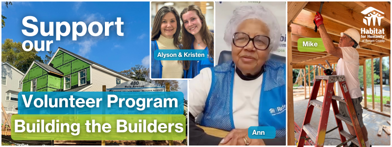 Every gift helps a family build a foundation. Families who partner with Habitat, build their own homes alongside volunteers, and then pay an affordable mortgage. Your financial support will help hardworking Bergen County families build strength, stability and independence through homeownership.